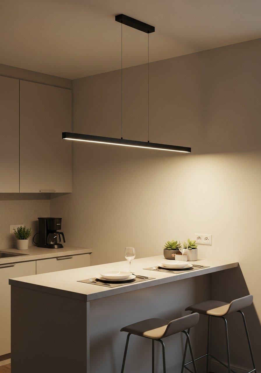 - Low-profile linear pendant, 36-inch matte black (~$90-150)