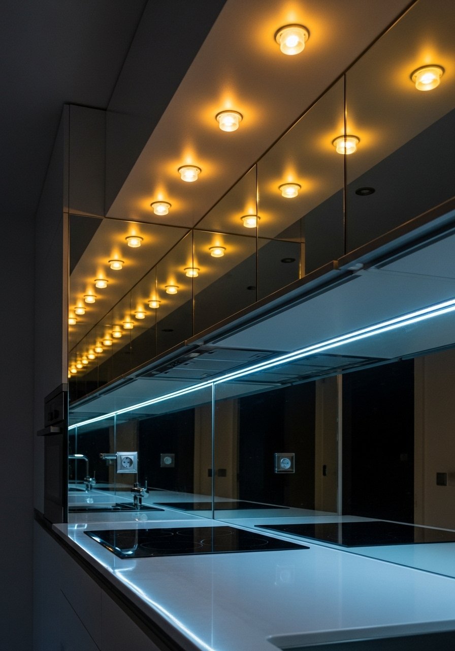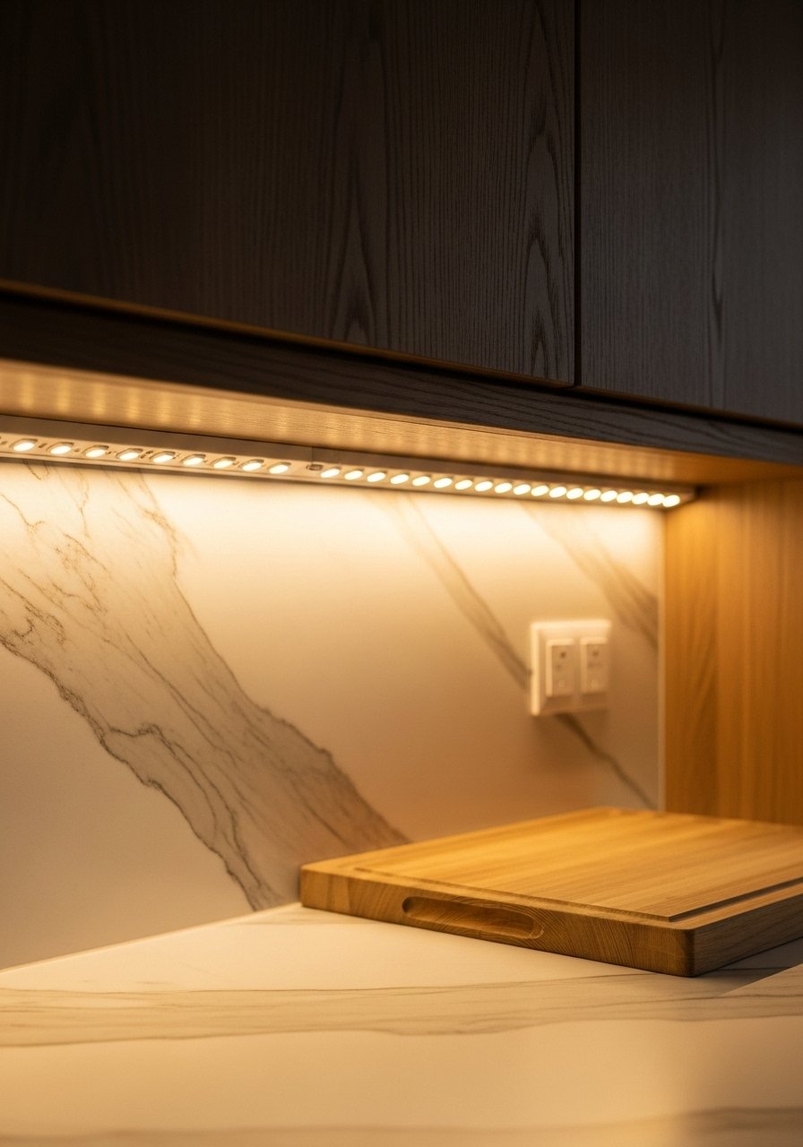 Under-cabinet LEDs changed how I prep food. They eliminate shadows without touching the ceiling. I installed warm white LED strip lights and used a dimmable switch. Tip: pick CRI 90+ for true color while cooking. Common mistake: lining strips too close to backsplash—leave 1/4" gap for even wash.