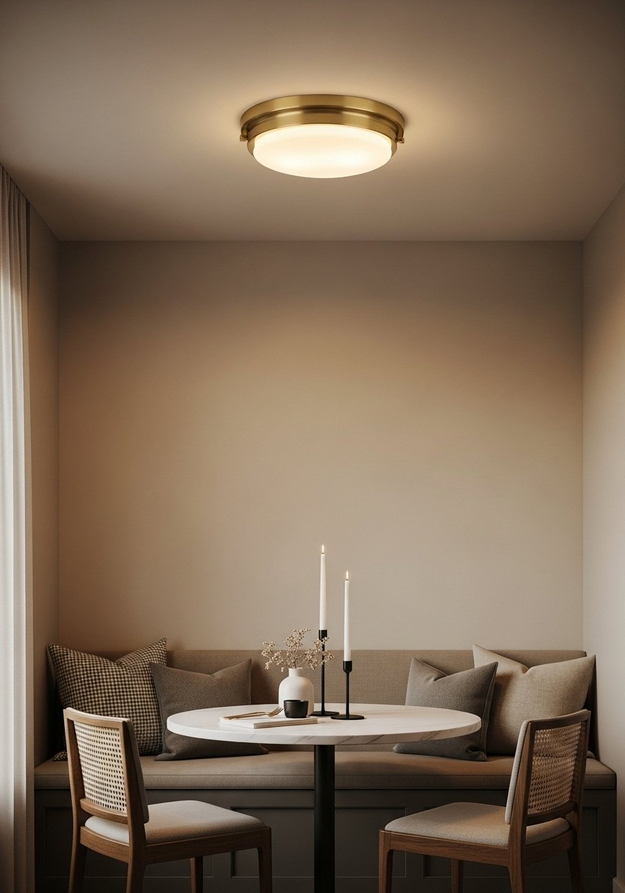 For the dining end of my kitchen, a low semi-flush fixture adds personality without hanging too low. Look for fixtures that hug the ceiling—semi-flush brass fixtures read luxe but don’t reduce headroom. Tip: choose white or frosted glass to soften glare. Mistake: picking too deep a fixture that crowds the space.