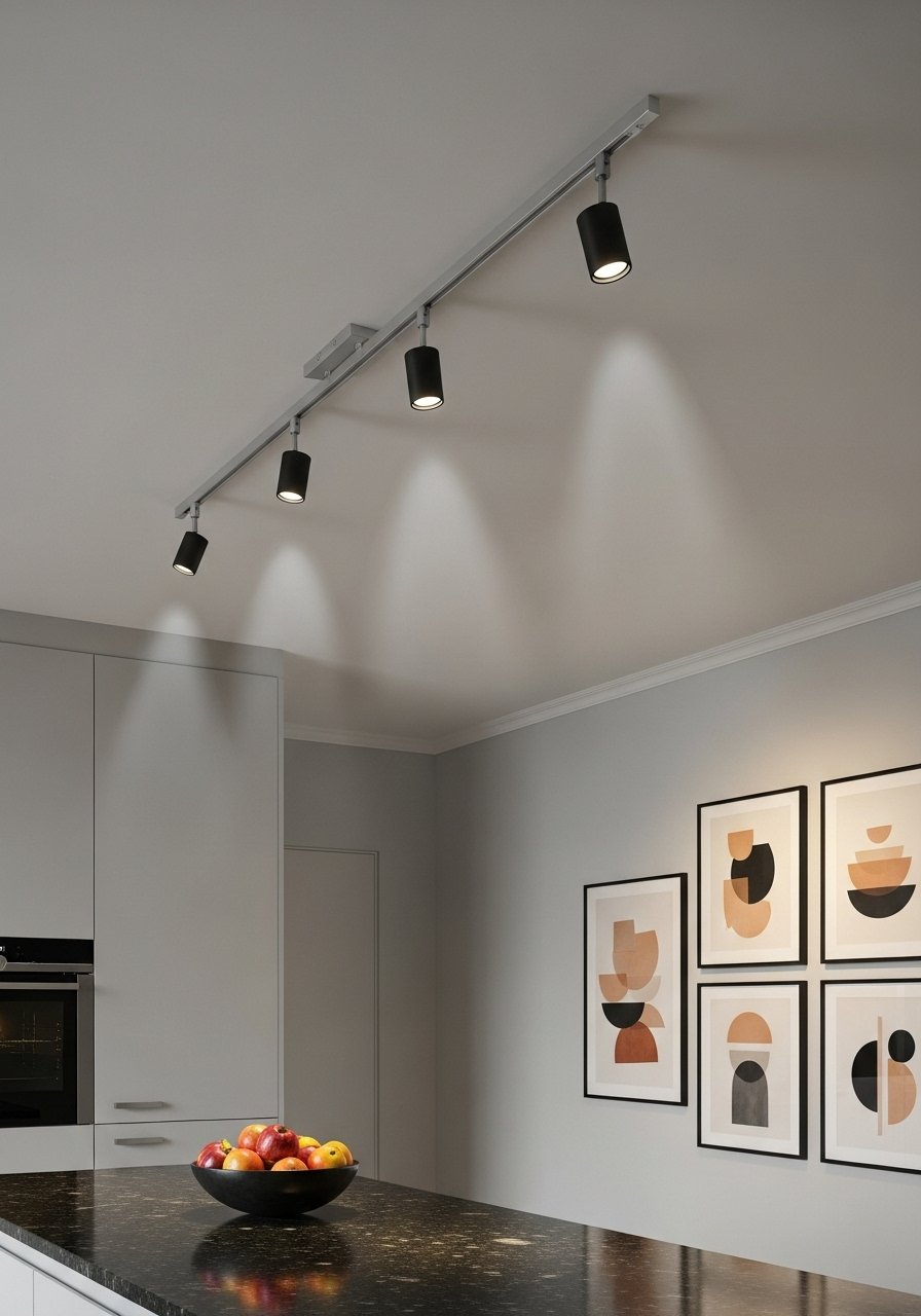 A slim single-track lets me shift light easily. The track sits flat to the ceiling. I chose low-profile track heads. Use fewer heads and brighter bulbs to keep ceilings feeling open. Mistake: too many heads—makes ceiling read busy.