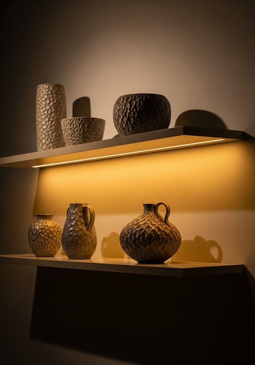 A slim LED strip under open shelves gives my ceramics a gallery feel and draws the eye up. I used under-shelf LED strips. Keep light warm and low to avoid harsh shadows. Mistake: bright cool light that makes the shelf feel clinical.