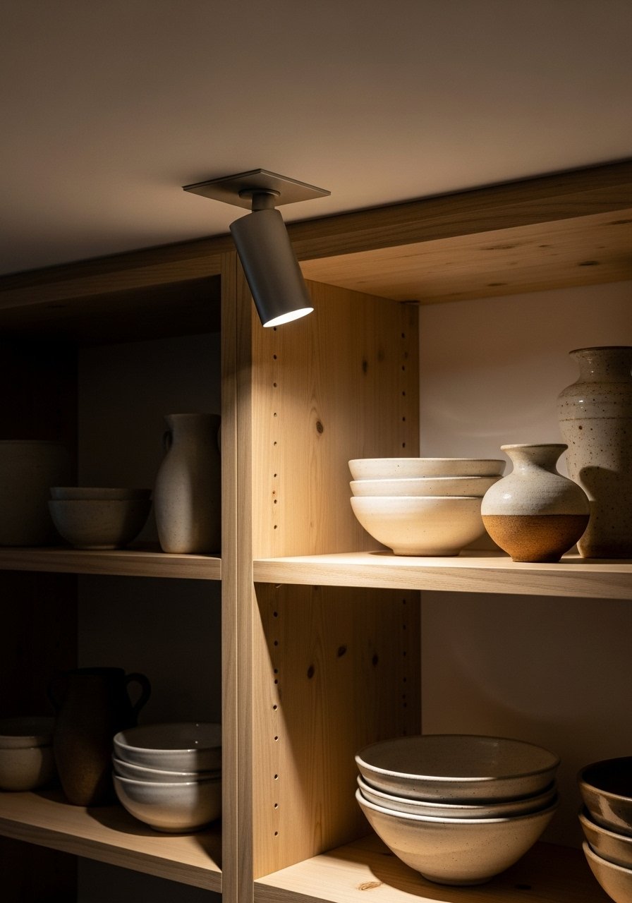 I use a gimbal can to highlight cookbooks and ceramics on open shelving. A gimbal recessed housing lets me direct light precisely. This makes displays pop and draws the eye away from boring cabinet fronts. Tip: choose 30–40° beam for shelves. Mistake: too many gimbals close together—odd-number groupings and varied heights look better.