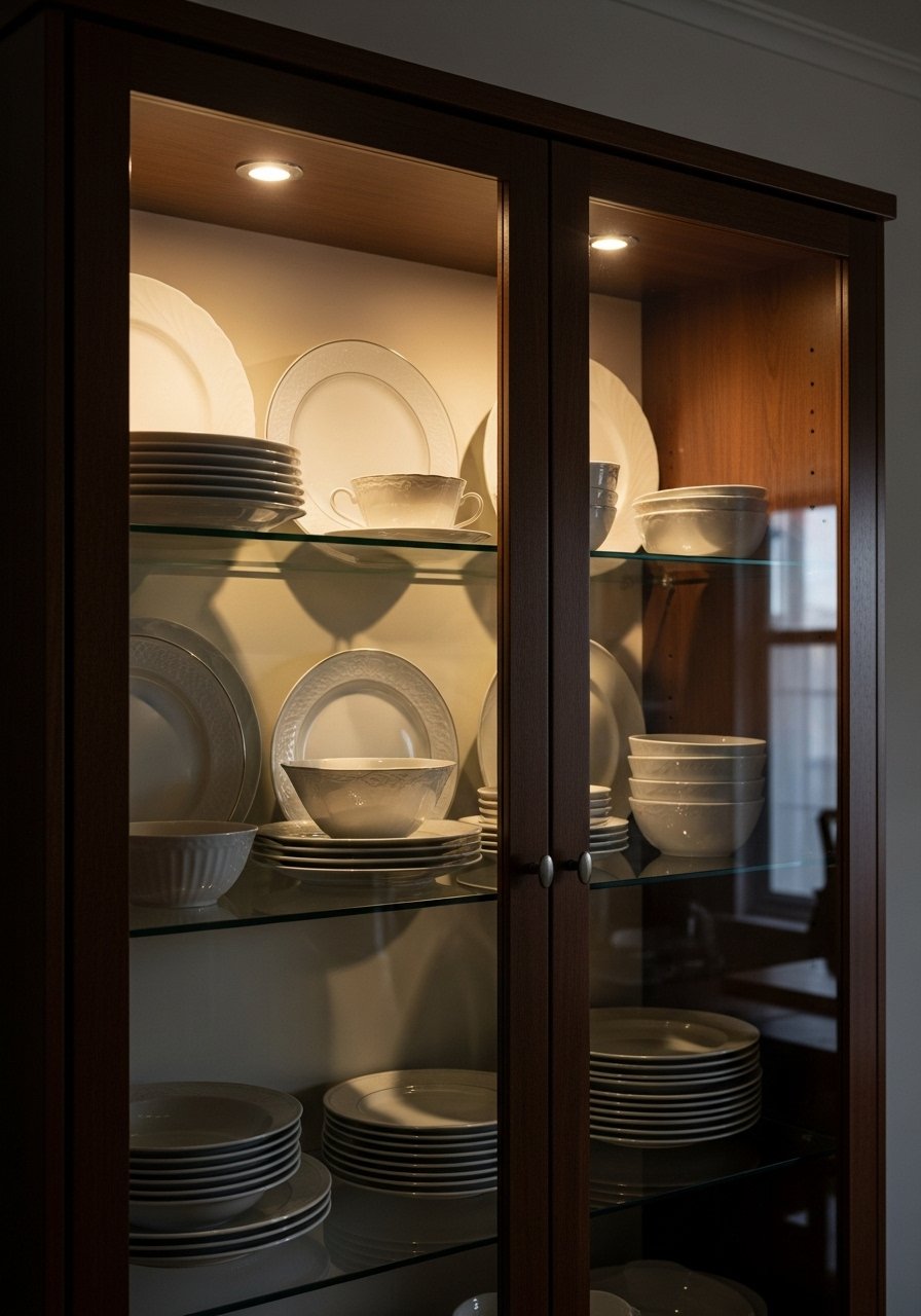 For glass-front cabinets I added LED puck lights. They’re subtle and make dishware glow. Use warm 2700K pucks and a tiny inline dimmer. Tip: group in odd numbers and stagger heights. Mistake: installing pucks without dimming—they can overpower small spaces.