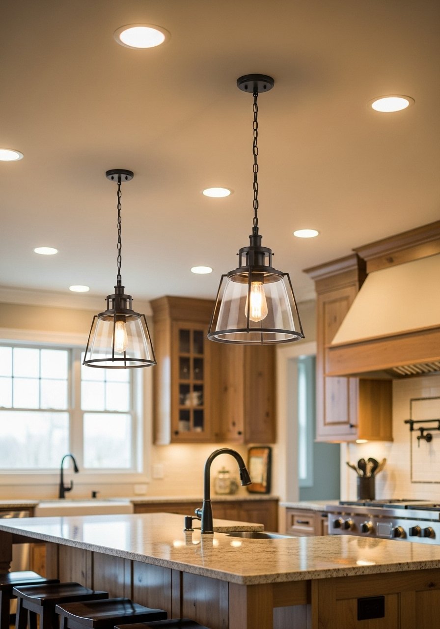 In my farmhouse-style kitchen, recessed LEDs give clean ambient light while two farmhouse pendants provide personality. The pairing feels intentional and not cluttered. Tip: keep metal finishes consistent or intentionally mixed (brass + black). Mistake: too many focal fixtures—let the pendants be the islands’ focus.