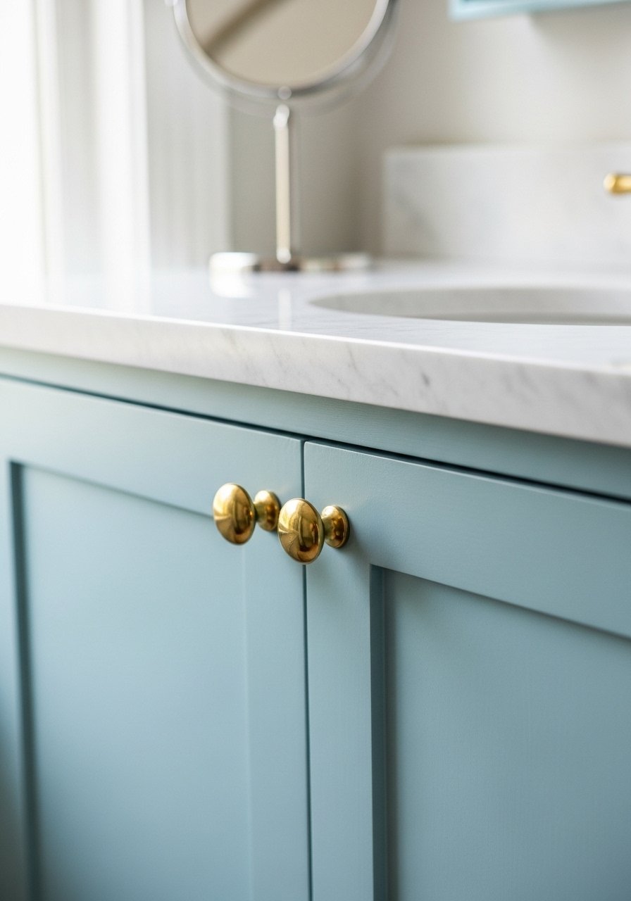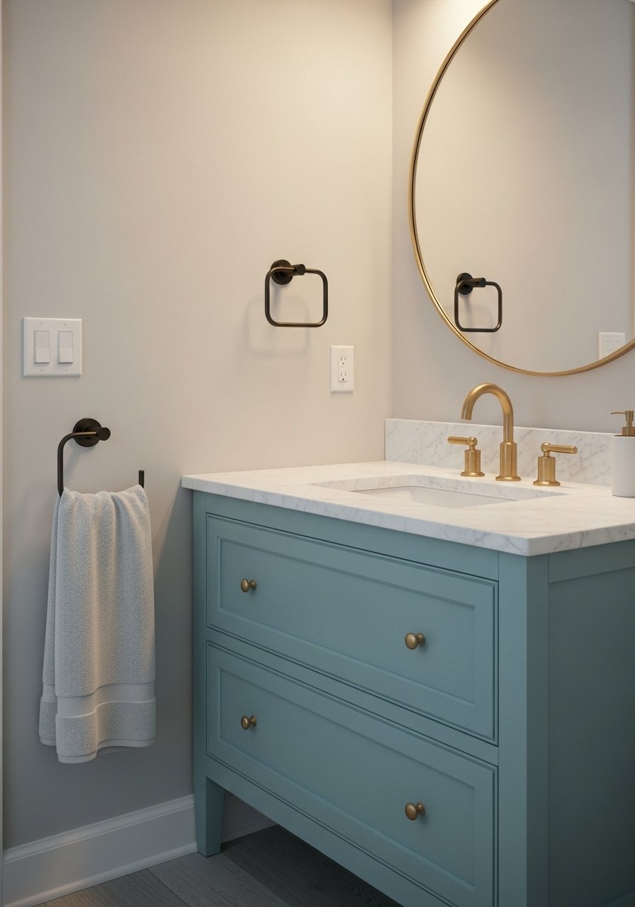 I used brass knobs on a light blue vanity and matte black towels hooks—mixing metals kept the palette interesting without clutter. Brass knobs search is an easy swap. Tip: limit to two dominant metals and introduce a third sparingly. Mistake: too many finishes at once—stick to a primary and secondary metal.