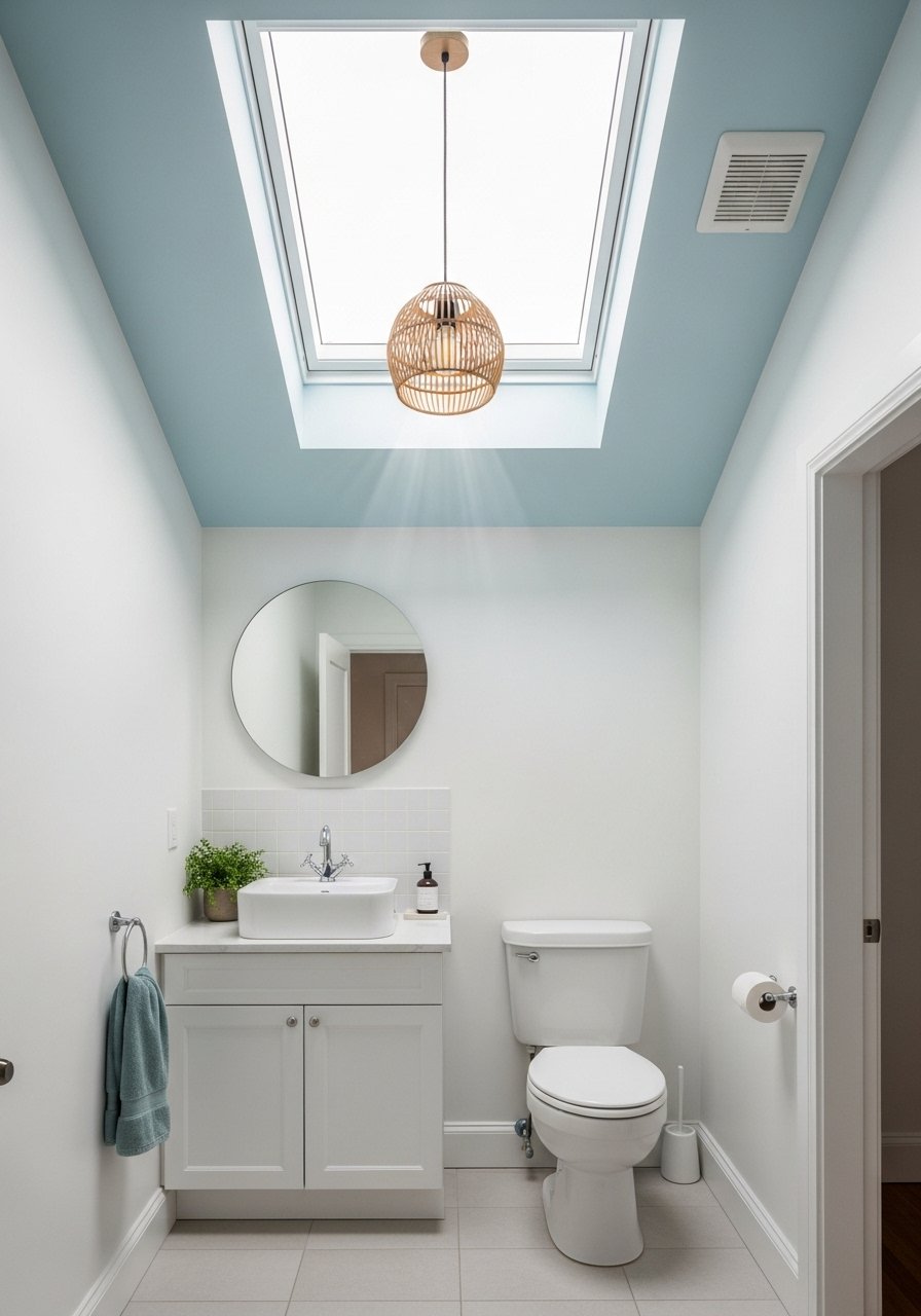 Painting the ceiling a pastel blue is the old decorator trick I rediscovered—it reads like open sky and takes attention upward. I used a light-reflective eggshell paint so the ceiling doesn't look flat. Styling tip: coordinate a pastel blue accessory (soap dish, hand towel) to tie the ceiling into the room. Mistake: pairing a pastel ceiling with dark walls—stick to light walls for expansion.
