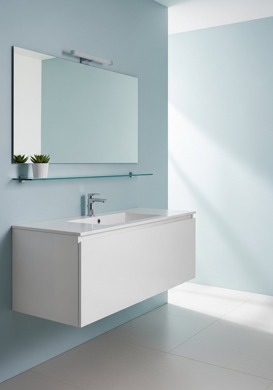I painted my old vanity a pastel blue (think Benjamin Moore Breath of Fresh Air) and it instantly softened the whole space. A pale blue vanity reads larger than dark wood because it reflects light and reduces contrast. I paired it with a brushed brass faucet and white towels to keep the palette airy. Styling tip: keep accessories to a 2:1 white-to-blue ratio so the blue reads intentional, not overwhelming. Mistake to avoid: using high-gloss lacquer on tiny vanities—it can look toy-like. Matte or eggshell finishes feel more grown-up.