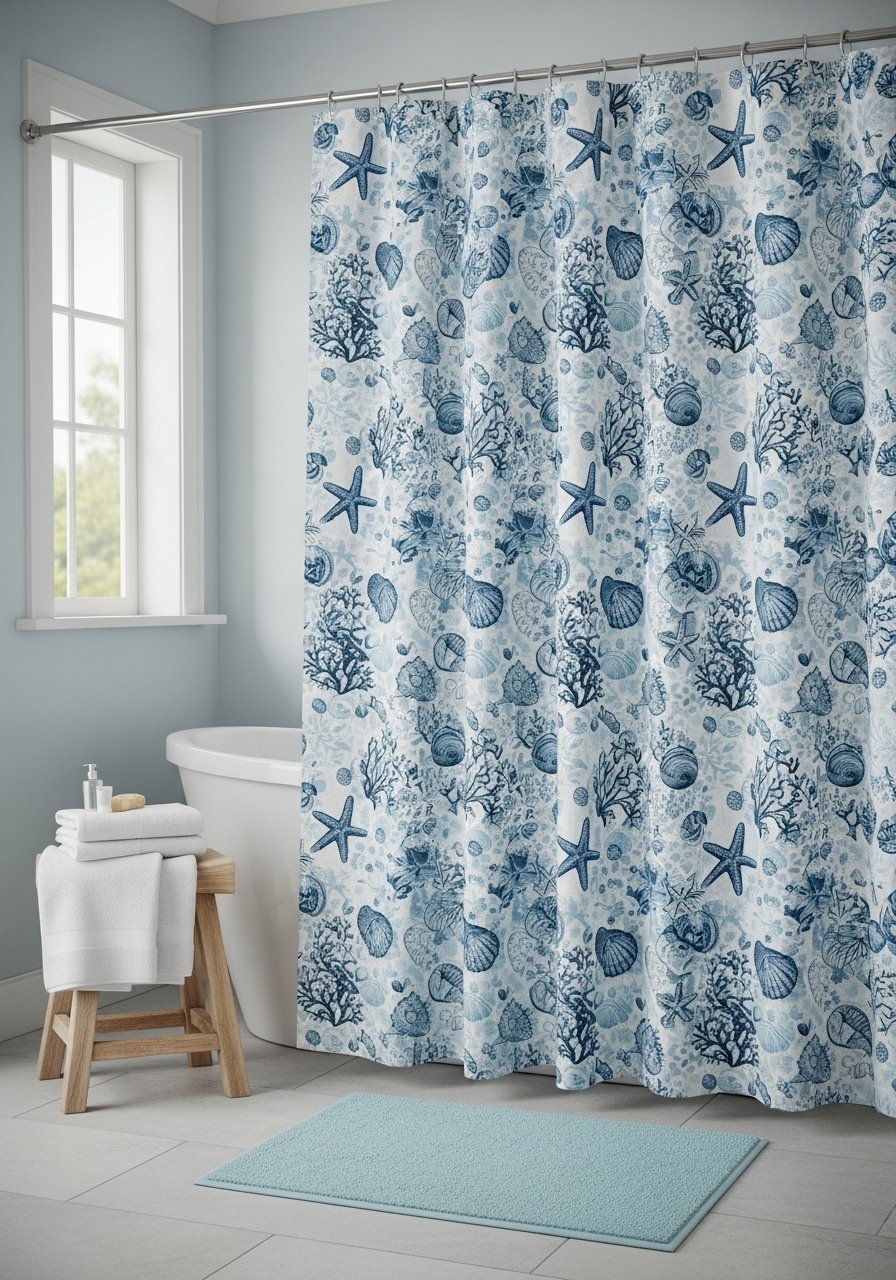 A patterned shower curtain in shades of light blue and navy gives instant personality with minimal effort. I grabbed an aqua fabric shower curtain and swapped hooks for brass ones. Tip: choose a curtain length that just kisses the tub edge to keep the room feeling neat. Mistake: mismatched scale—tiny prints in large rooms read busy; go bold in small rooms.