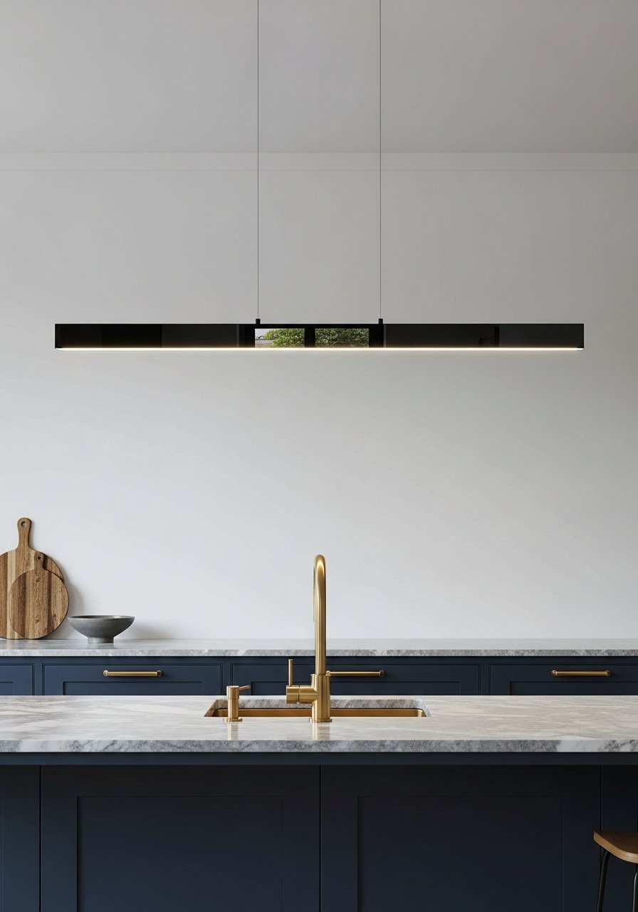 I installed a 36-inch linear pendant centered over my island. The warm glass and slim metal bar made counters and cabinet hardware pop. For balance, hang it 30–36 inches above the island surface. Use a frosted shade to avoid glare on glossy countertops. Mixing brass accents on the fixture with warm 3000K bulbs made the painted cabinets read deeper. Avoid pendants that are too heavy visually — they compete with statement hardware.