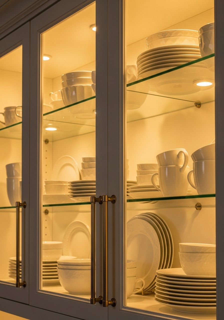 I added tiny pucks and side strips inside my glass cabinets. It makes white dishes and brass cups glow and adds depth. Use warm 2700–3000K light for a luxe feel. Mistake to avoid: using bright white that washes out dish color. I run a low-intensity dimmed circuit so this becomes ambient glow, not spotlighting.