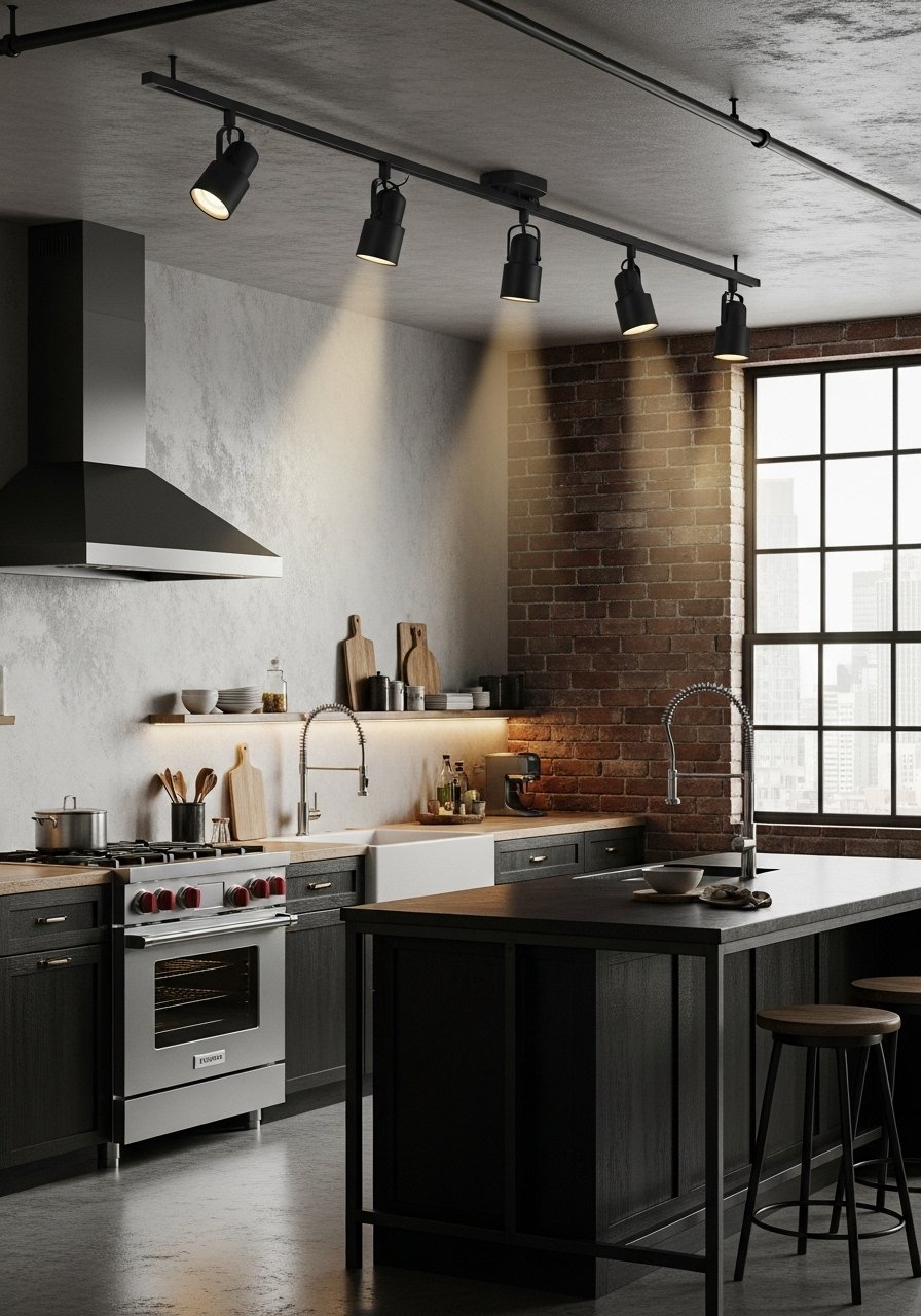 Track lighting gave me flexibility when I rearranged appliances. Aim heads at prep surfaces, the sink, and a focal backsplash tile. Use directional LED heads with 3000K bulbs. Avoid putting heads too close to the backsplash to prevent glare on shiny tiles. Track is cheaper than rewiring for multiple recessed fixtures and looks intentional in an industrial scheme.