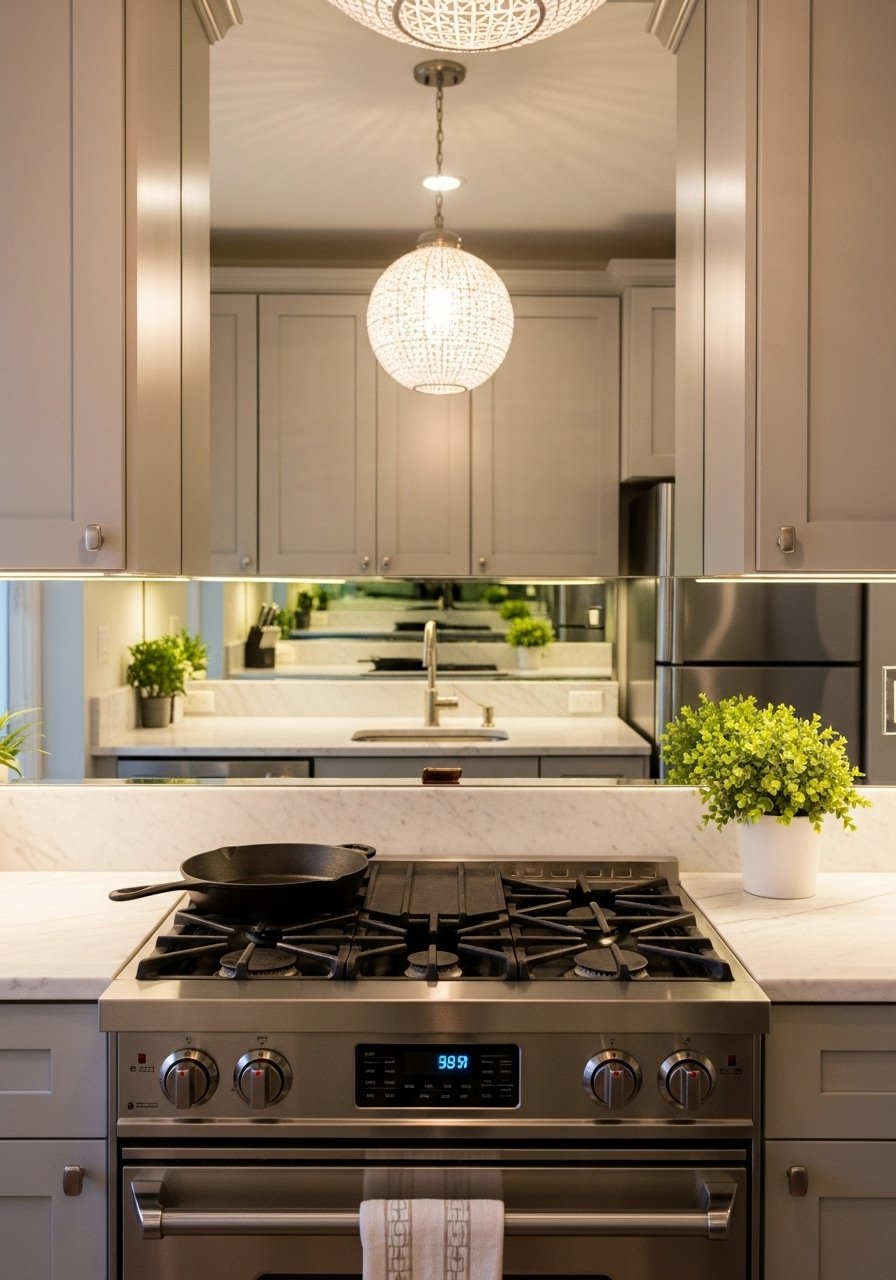 Mirror and Reflective Backsplash Tricks to Amplify Light (Small Kitchen Lighting Ideas)