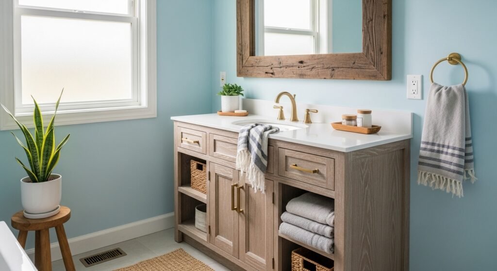 14 Rustic Blue Bathroom Ideas That Mix Wood Tones and Vintage Charm