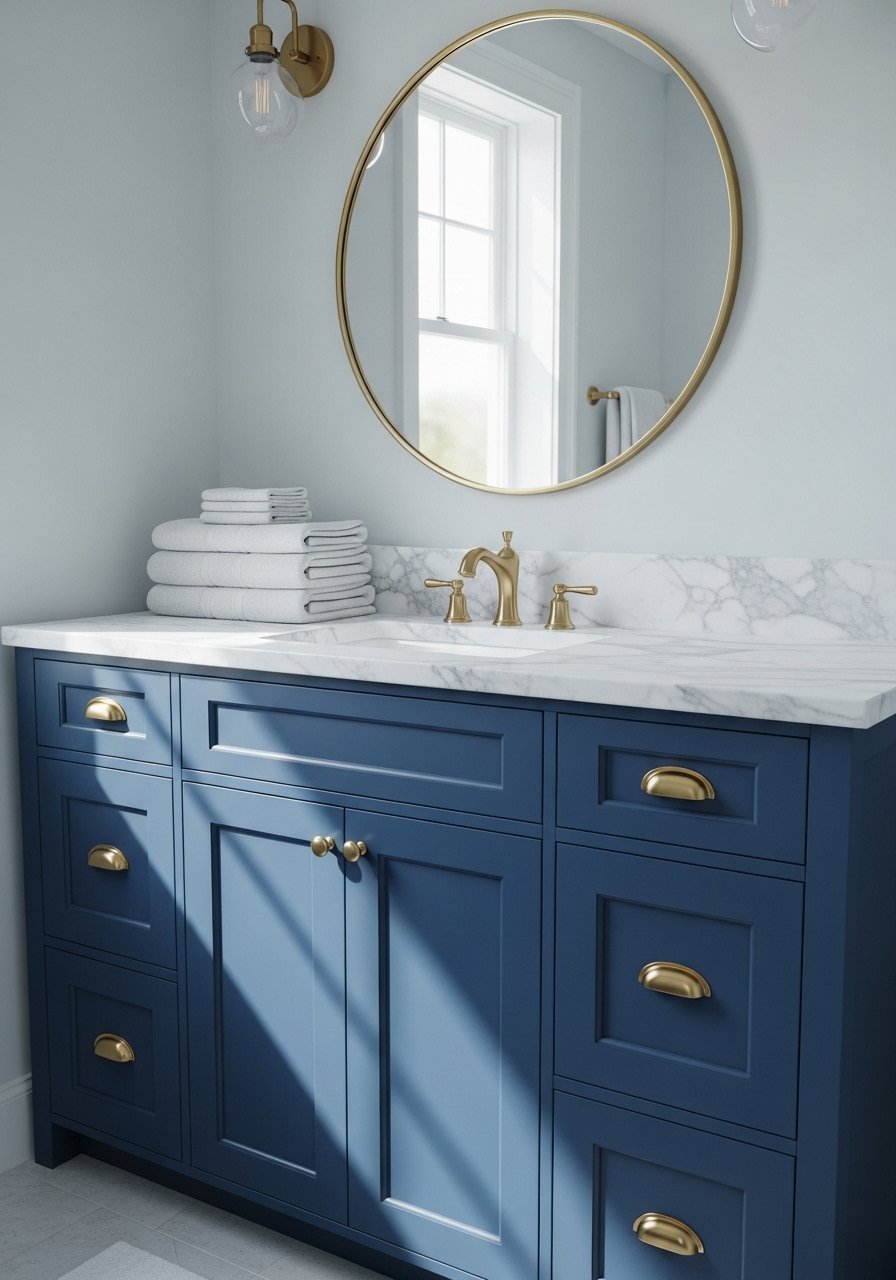 A royal blue vanity reads luxe, not heavy, when the countertop is light and fittings are warm brass. I installed a 36" royal blue shaker vanity and used a white quartz top. The contrast keeps it bright. I recommend brass faucets like this and 36-inch round mirror. Styling tip: keep textiles 2:1 light-to-dark—two white towels for every navy accent. Mistake to avoid: matching too many dark finishes. Mix in a warm metal for balance.