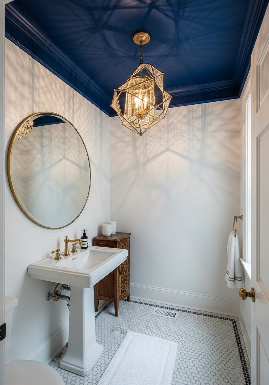 Painting the ceiling indigo draws the eye up and creates drama without darkening the room. I used a low-sheen indigo and kept walls soft white. This trick works best with a large mirror to reflect the ceiling. Mistake: using a flat finish — low-sheen bounces light better.
