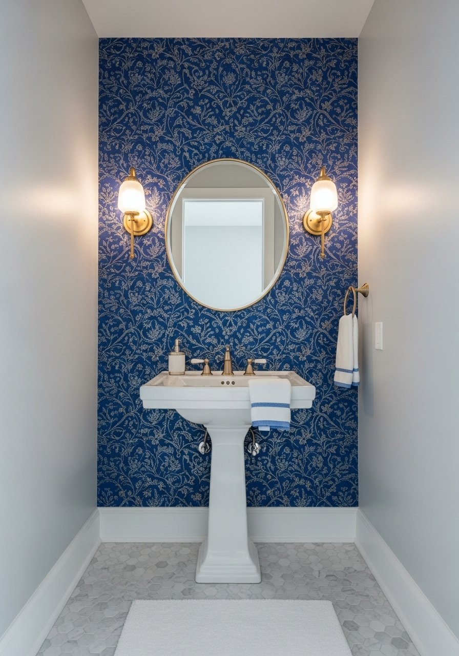 Royal Blue Wallpaper on One Wall (Bold Powder Room)