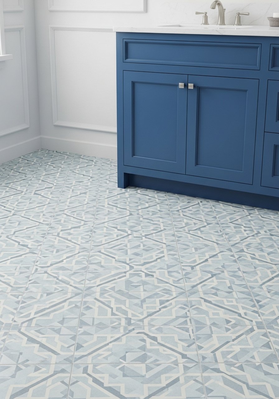 A light blue patterned floor adds energy and keeps royal accents from dominating. I used polymer tiles for easy install. Keep wall color neutral and accessories in navy and brass. Mistake: choosing a floor pattern bigger than the space—scale matters.