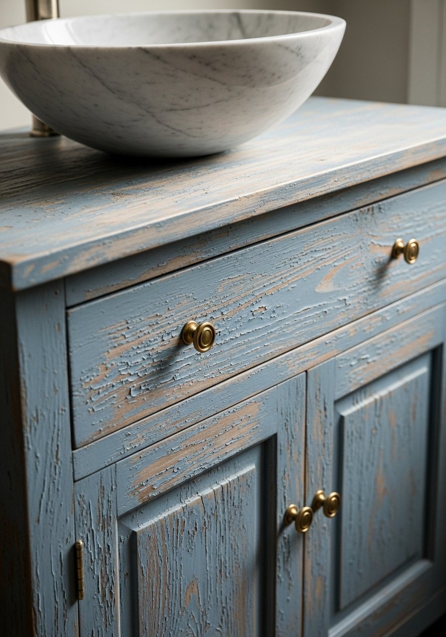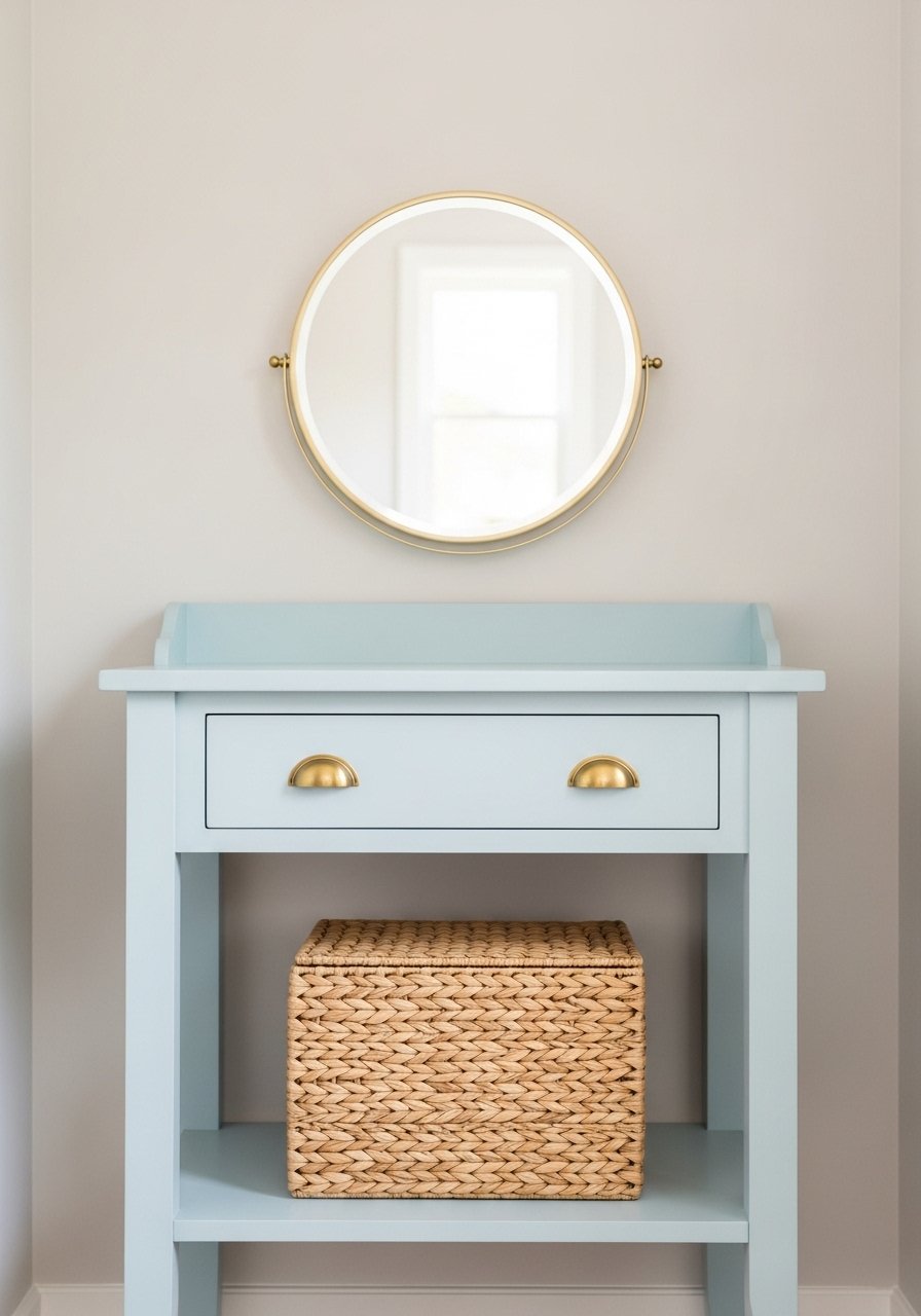 I converted a thrifted vanity with a fresh powder-blue paint and left an open lower shelf. I swapped hardware to brass knobs and added a woven basket for supplies. The look feels collected and useful. I used a ceramic soap dispenser to reinforce the vintage feel. Mistake: too many small baskets—one larger basket reads cleaner.