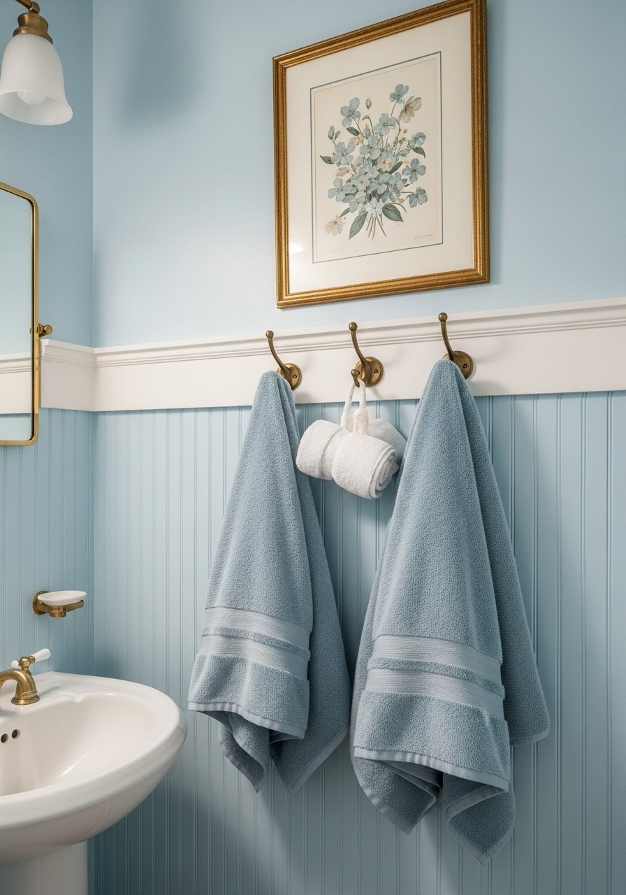 Beadboard painted in a soft blue instantly adds charm. I painted the beadboard three feet up and left white walls above. The contrast keeps the ceiling feeling higher. I swapped plain chrome for a brass towel bar to give warmth. The result feels tidy and calm. Styling tip: hang a single vintage frame at eye level for scale. Mistake: painting beadboard with low-quality paint—use semi-gloss for easier cleaning.