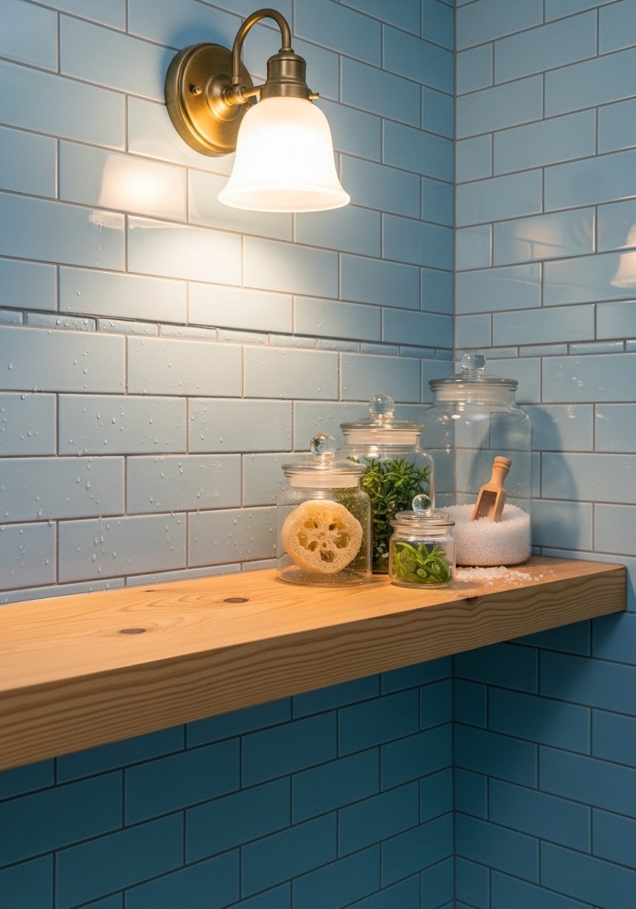 I tiled just the shower niche in small hex tiles. Then I added a slim wooden shelf to display shampoo in glass bottles. The blue pops without overwhelming. Styling tip: choose slip-resistant tile on shower floor. Mistake: using wood directly on wet surfaces—seal it well.