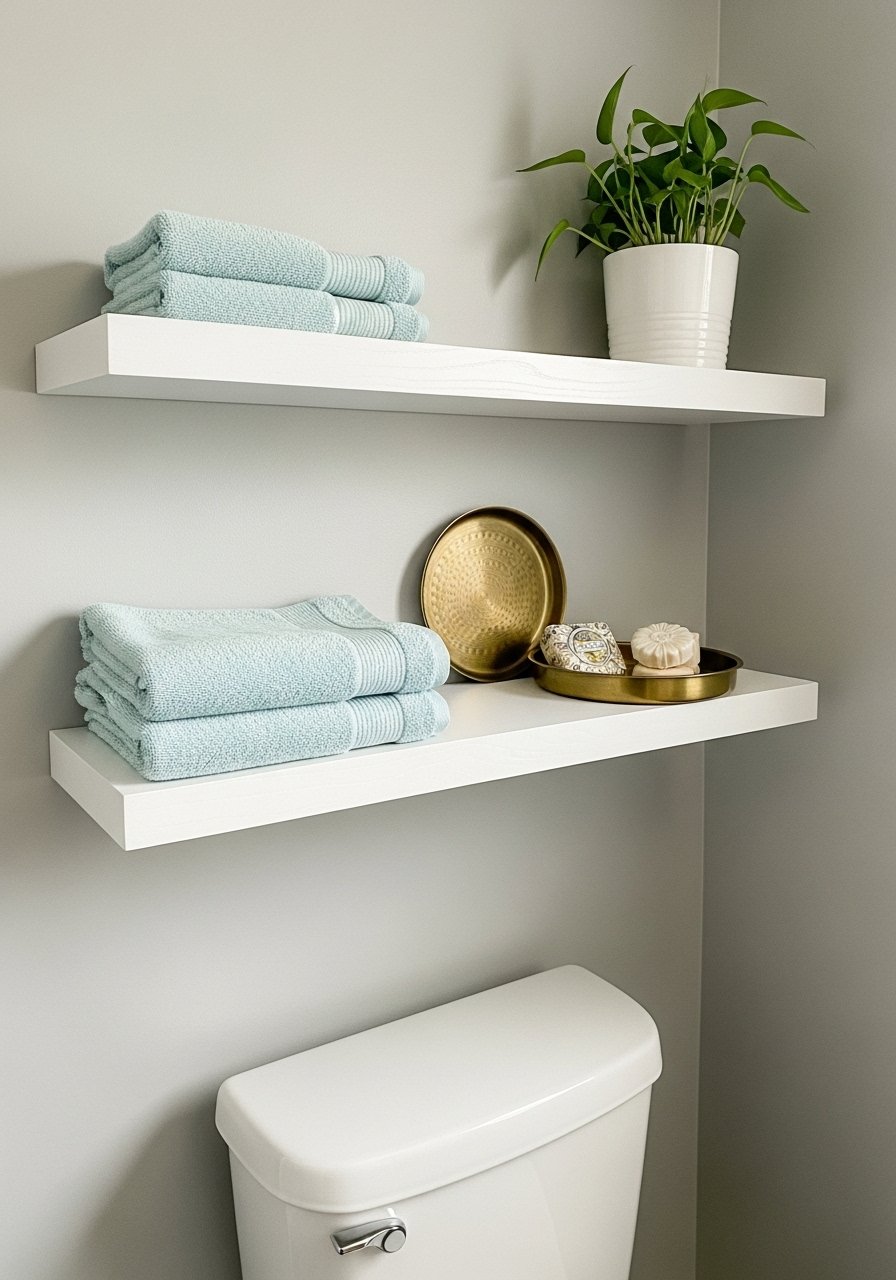 Open shelving shows off towels and vintage jars. I installed a pair of white oak shelves and used odd-numbered groupings. The pastel-blue towels become a repeating accent. Styling tip: use 2:1 textures—soft towels to rough wood. Mistake: overcrowding shelves; leave breathing room so the wood still reads.