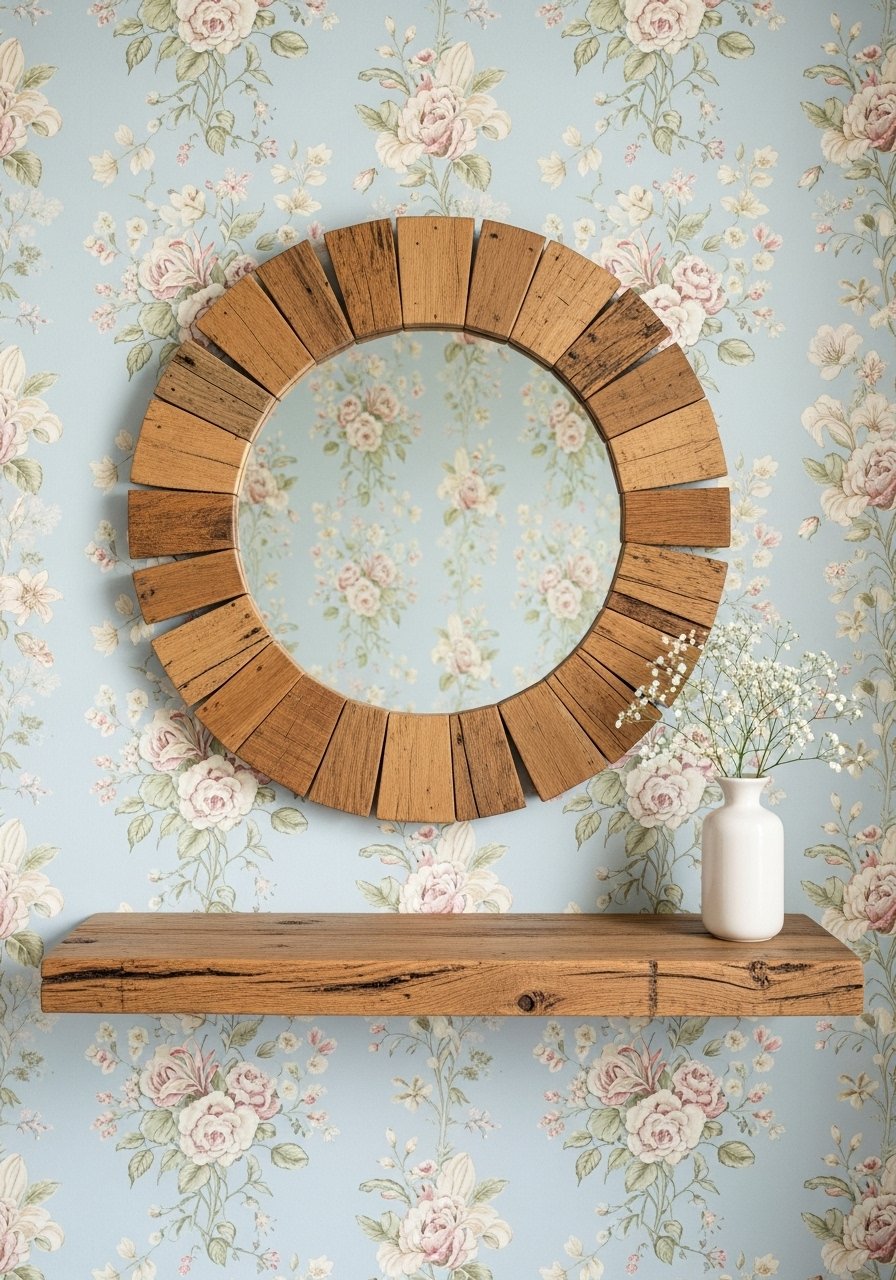 - Reclaimed wood framed mirror, 24-inch round (~$80-150)