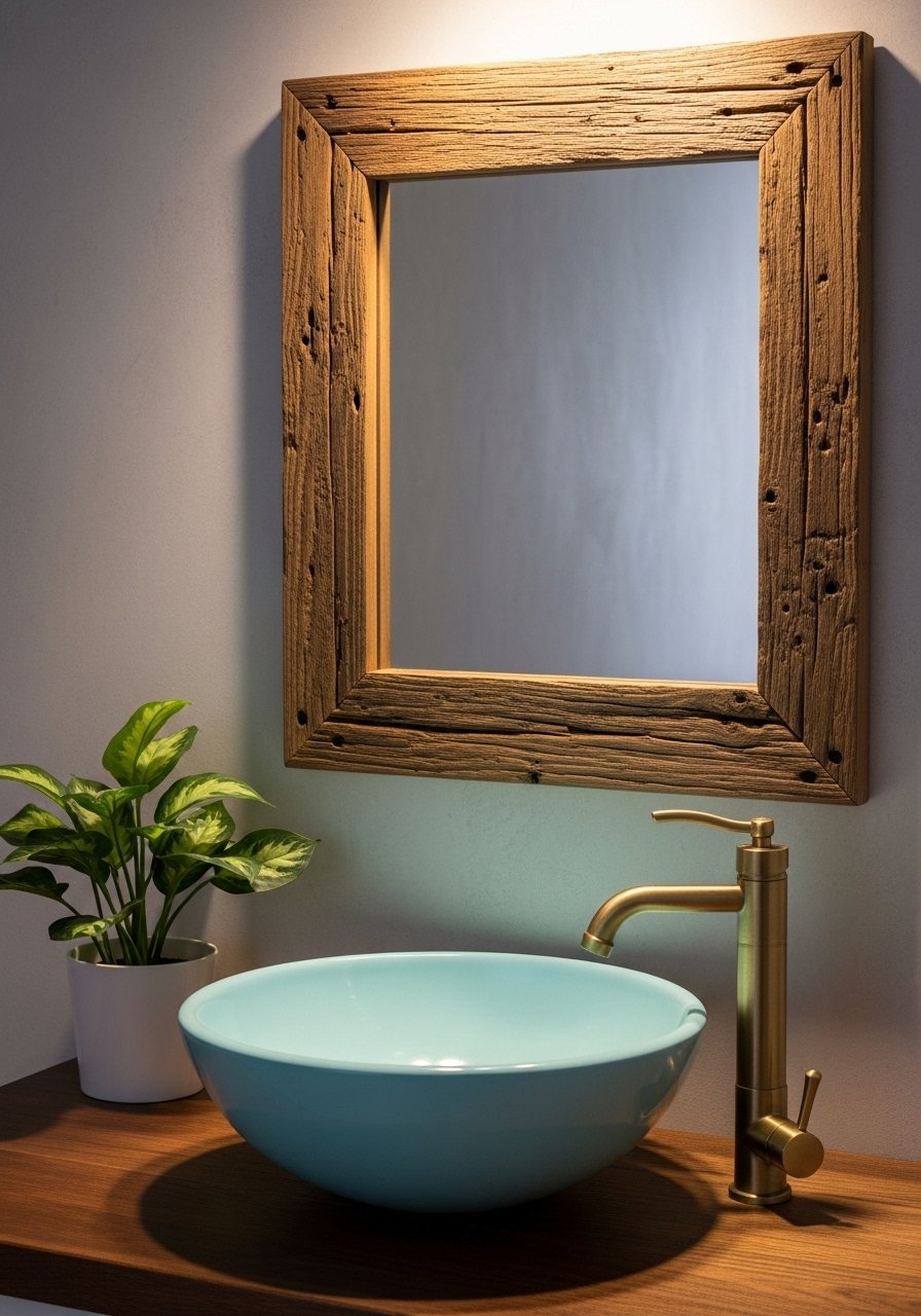 Reclaimed Wood Mirror Over Pastel Sink — Boho Rustic Focal Point