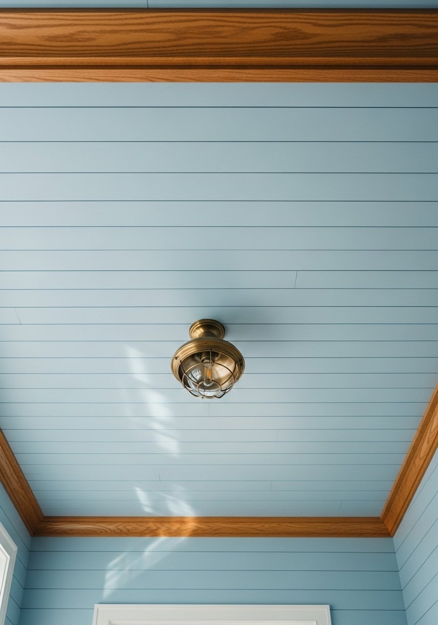 Shiplap Ceiling in Light Blue With Warm Trim — Unexpected Rustic Detail