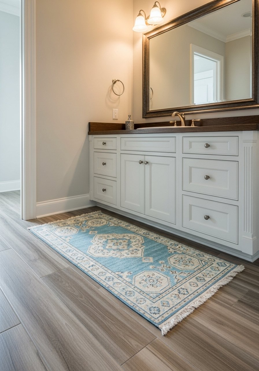 I replaced my warped vinyl with wood-look porcelain tile. It reads like oak but handles moisture. I layered a small pastel-blue rug to keep warmth underfoot. I used a jute bath mat for a rustic touch. Styling tip: choose tiles with a matte finish for traction. Mistake: real wood on bathroom floors without proper sealing.