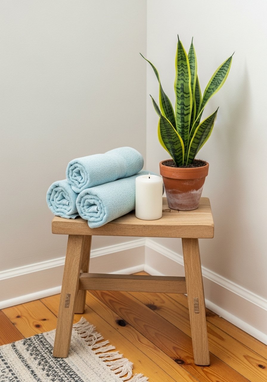 For tiny bathrooms, I create a spa corner. A simple wooden stool, rolled pastel towels, and a 3ft artificial snake plant make the tub area feel intentional. Keep trays minimal. Styling tip: use odd numbers—three towels, two candles. Mistake: cluttering the stool—one stacked item keeps it chic.