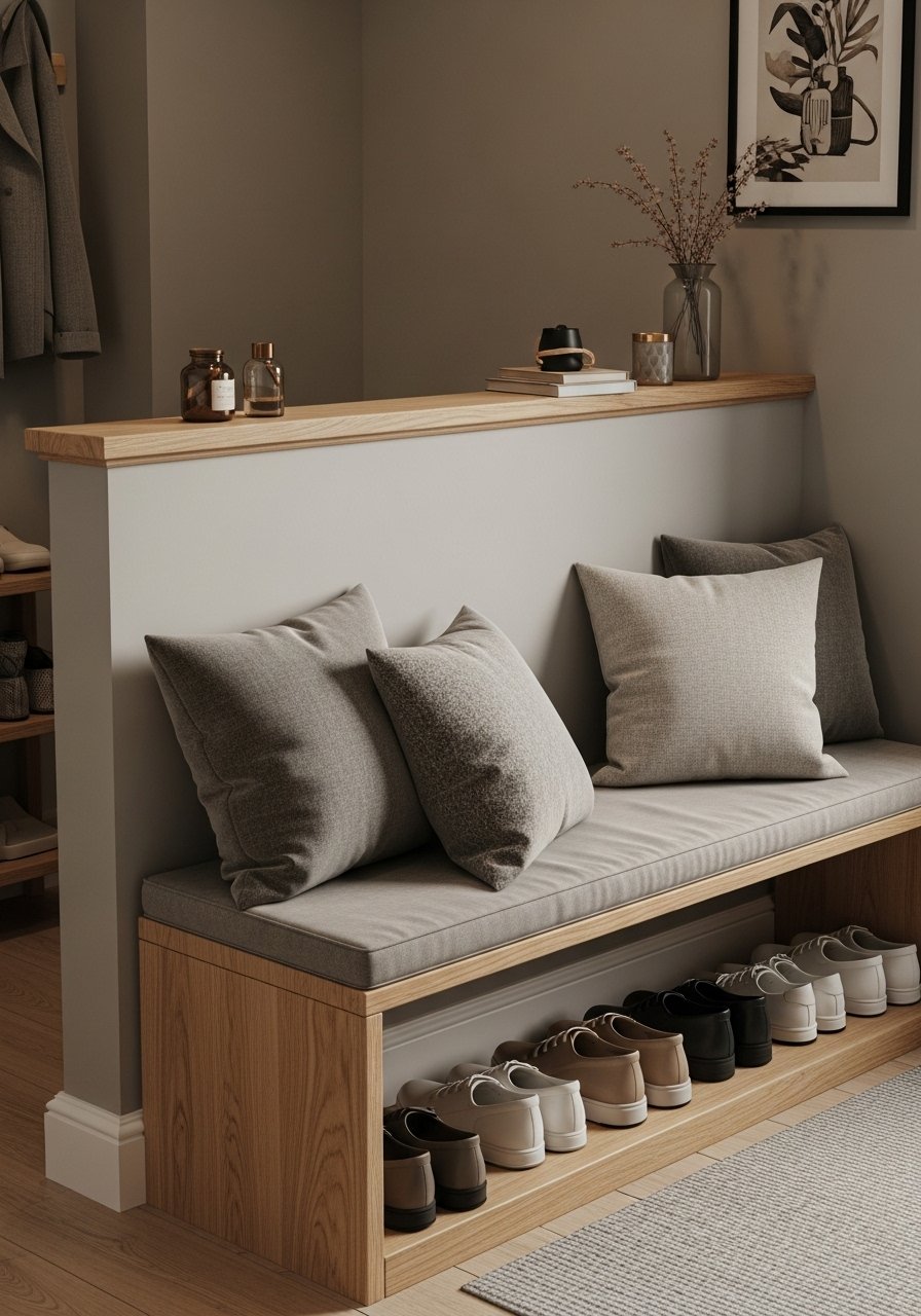 I built a half-height divider using a short bookshelf and a cushioned bench on the entry side. The shelf top is perfect for mail trays and a small lamp. It reads like a mudroom without blocking light. Styling tip: keep bench cushion in neutral linen and use one bold pillow for contrast. Avoid using low-quality bench fabric that stains easily—pick washable covers.