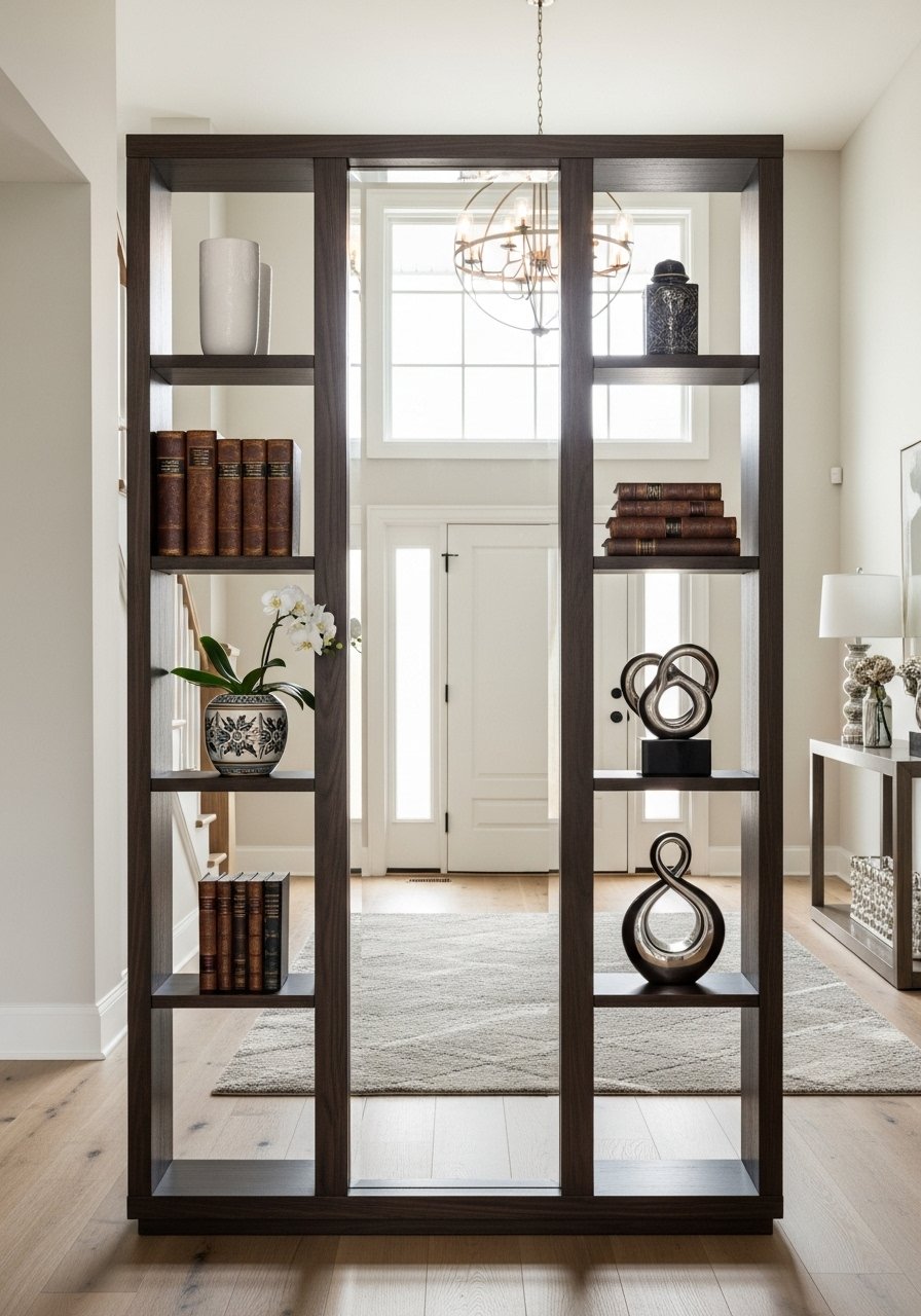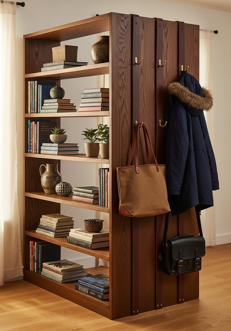 I use an open shelving unit that reaches the ceiling. One side faces the living room with decor; the entry side has brass hooks for coats. The vertical lines add height and separate zones without closing the room. Styling tip: mix decorative objects and functional baskets in a 2:1 texture ratio. Mistake to avoid: overloading hooks—limit to two heavy coats per hook to prevent sagging.