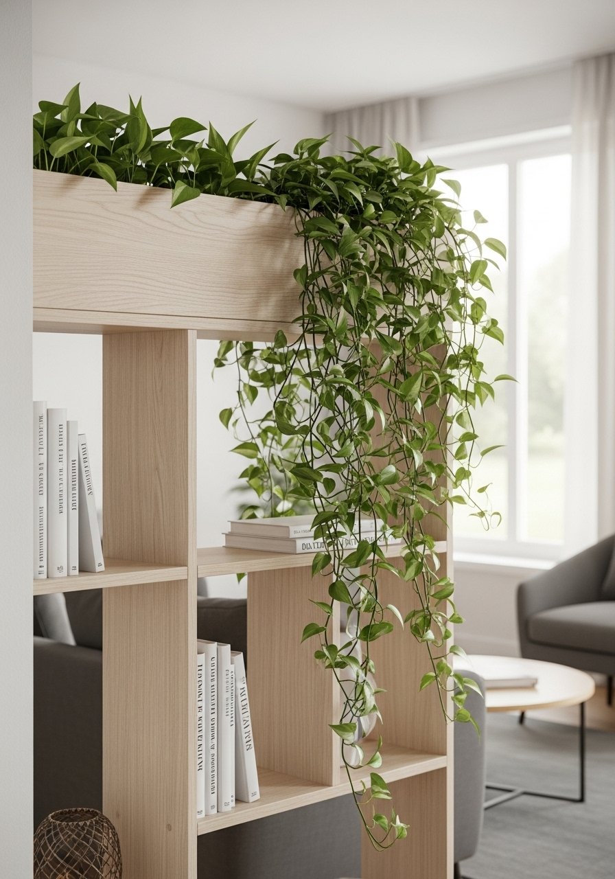 This idea kills two problems: storage and a cold divider surface. I placed long planters on a top shelf to conceal baskets beneath. The greenery hides clutter and creates a softer boundary. Tip: use artificial trailing plants if upkeep is an issue. Avoid overwatering if using real plants—moisture can damage wood shelves.