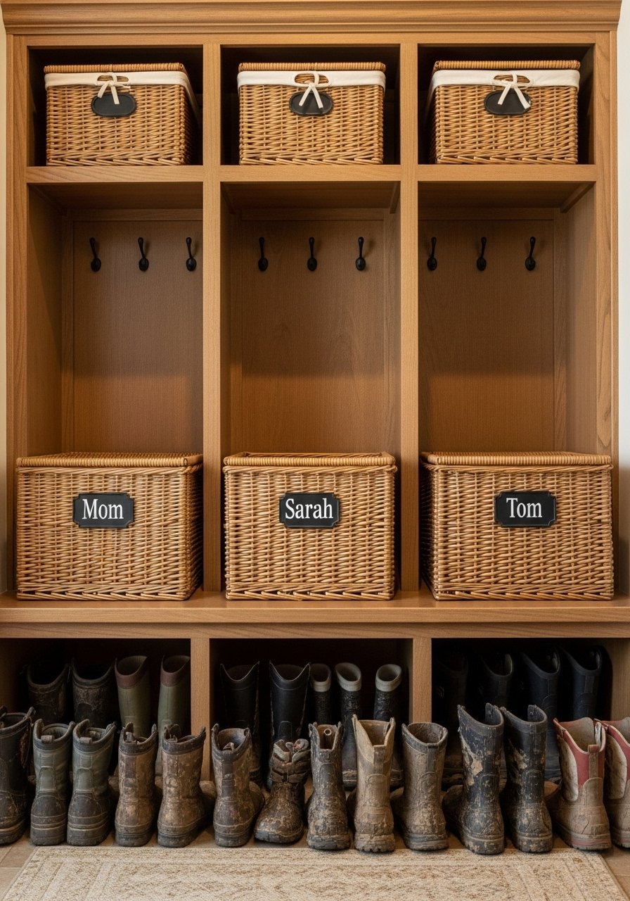 I labeled baskets for each family member and kept daily shoes in lower cubbies. A small chalkboard on the divider holds reminders. It reduces lost mittens and morning chaos. Styling tip: neutral basket tones keep it tidy; add one fun color per kid. Don’t skip basket liners—they make cleaning easier.