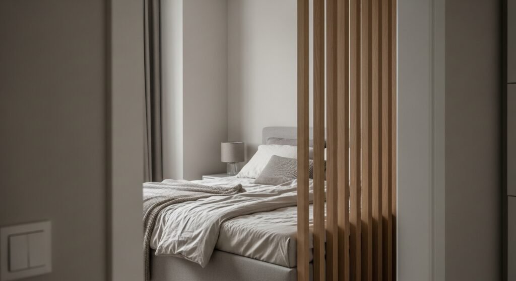 Wooden slats on the wall framing a bed nook through an open door – total privacy tease. It’s subtle yet effective for small spaces. We added slats like this behind my sister’s bed divider, and now her room feels custom-built, not cramped.