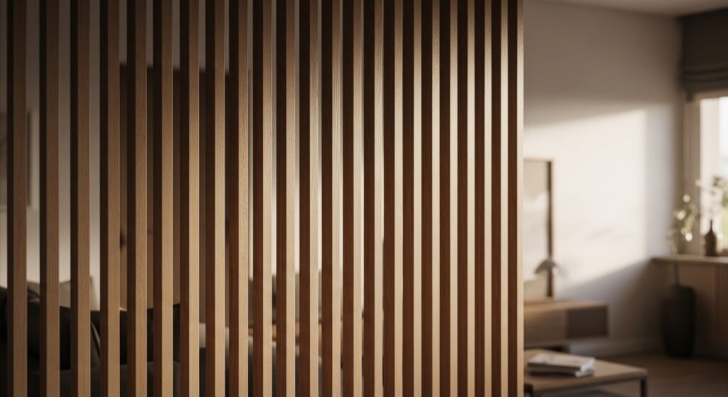 Those wooden slats filling the living room? Total texture heaven without overwhelming the furniture. You can tuck plants or books behind it for hidden storage – genius. I did this once and my cat loved lounging in the shadows; it became her VIP spot.